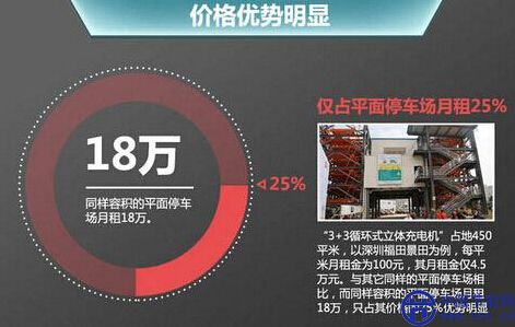 “3+3循環(huán)式立體充電機(jī)”占地450平米,以深圳福田景田為例,每平米月租金為100元,其月租金僅4.5萬元,與其它同樣的平面停車場相比,而同樣容積的平面停車場月租18萬,只占其價格的25%,優(yōu)勢明顯。