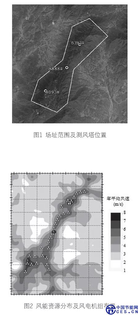 場內(nèi)已設有三座測風塔,編號分別為6393#、8093#及8888#,塔體高度分別為70m、50m和80m,海拔高程分別為1465m、1586m和1326m,目前均已測風滿一年。風電場的場址范圍及測風塔位置如圖1所示。