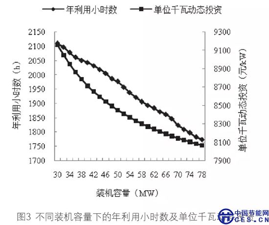 圖3為在不同裝機容量下的年利用小時數(shù)與單位千瓦動態(tài)投資。