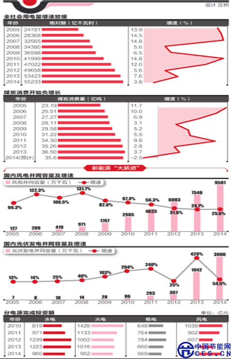 2014年,全社會(huì)用電量僅增長3.8%,創(chuàng)下近十年新低:而全國6000千瓦及以上電廠發(fā)電設(shè)備平均利用小時(shí)為4286小時(shí),同比減少235小時(shí),是1978年以來的最低水平。除水電外,火電、太陽能、光伏發(fā)電小時(shí)數(shù)均下降。