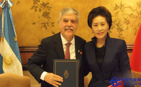 阿根廷計(jì)劃部部長(zhǎng)Julio De Vido與中國(guó)的上海新源啟能風(fēng)力技術(shù)有限公司董事長(zhǎng)田林芝簽署供電電價(jià)協(xié)議