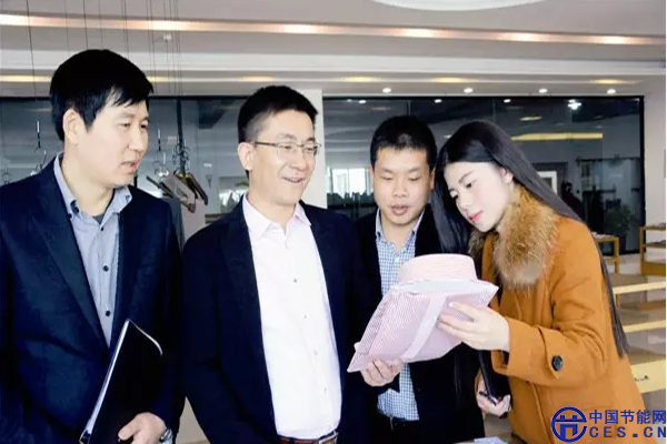 江陰福斯特紡織有限公司董事長(zhǎng)楊國(guó)鋒(左二)與企業(yè)人員一起研究產(chǎn)品。徐國(guó)營(yíng)攝