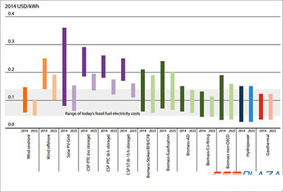 IRENA(國際可再生能源機(jī)構(gòu))之前發(fā)布的《2014年可再生能源發(fā)電成本》報告指出,在世界許多地區(qū),利用現(xiàn)有的各項技術(shù),已使可再生能源發(fā)電成本達(dá)到或低于化石燃料發(fā)電的水平。對于光熱發(fā)電的擁躉們來說,IRENA發(fā)布的報告中一個有關(guān)可再生能源發(fā)電LCOE(平準(zhǔn)化電力成本)的圖表是必須要關(guān)注的,其中顯示了去年光熱發(fā)電項目的LCOE和其2025年預(yù)測將達(dá)到的水平,這兩個LCOE的對比是令人吃驚的。
