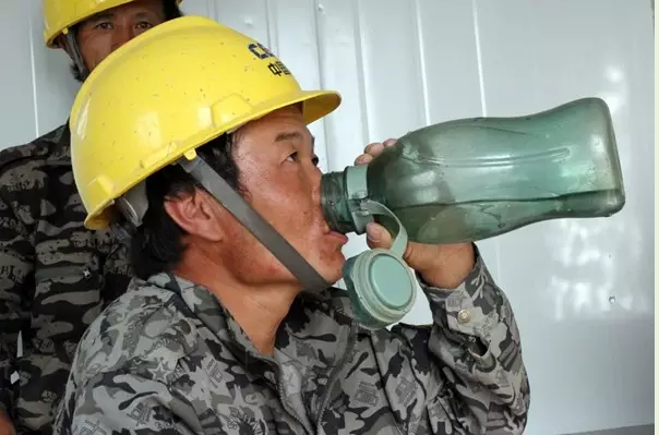 由于高溫環(huán)境下容易脫水,施工現(xiàn)場設置了飲水室。杯子小了喝水不得勁,于是每個人都會用一個巨大的杯子來裝水喝,2升的水杯,我們每天大約要喝掉6到8杯水。