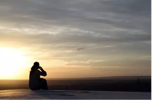 夕陽下的戈壁灘,拖著落日,像是一片睡著的海。