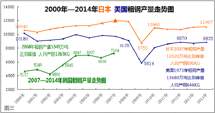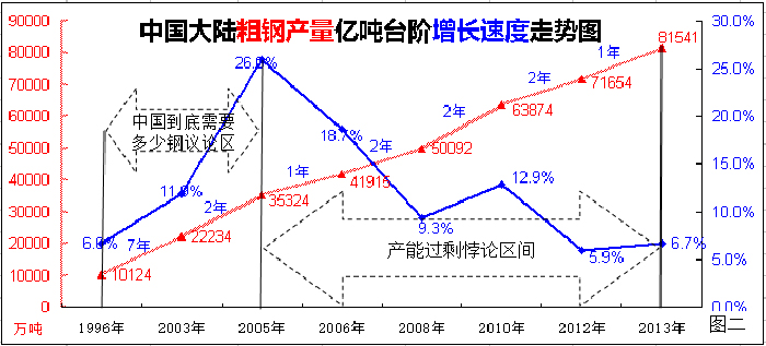 根據(jù)國統(tǒng)局修正數(shù)據(jù),2013年全國粗鋼產(chǎn)量由原來公告的7.79億噸,調(diào)整到8.15億噸。這說明,中國大陸的粗鋼產(chǎn)量在2013年就登上了8億噸臺(tái)階,而且從7億到8億的臺(tái)階只化了1年時(shí)間。由此認(rèn)為,這一組巨量數(shù)據(jù)至少表明三個(gè)方面的情況:一是從2003年起,我國粗鋼產(chǎn)量每一兩年登個(gè)億噸臺(tái)階,不僅相當(dāng)輕松,而且十分穩(wěn)健;二是不管行業(yè)產(chǎn)能過剩的爭(zhēng)論如何,粗鋼產(chǎn)量十多年來始終近似45度的斜率增長,這個(gè)巨量數(shù)據(jù)既是中國鋼鐵工業(yè)發(fā)展的必然,更是中國經(jīng)濟(jì)社會(huì)發(fā)展的必須。充分反映,十多年來,鋼鐵巨量的快速增長不僅僅是經(jīng)濟(jì)社會(huì)發(fā)展的要求,更是經(jīng)濟(jì)、社會(huì)發(fā)展的切實(shí)需要。當(dāng)然,也是“中國到底需要多少鋼”和“鋼鐵產(chǎn)能嚴(yán)重過剩”的有力回答。(見圖二)