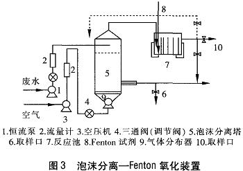 泡沫分離一Fenton氧化裝置如圖3所示。該裝置根據(jù)生產(chǎn)情況間歇運(yùn)行,處理量為t2013'1/d,氣液比為19:1(體積比),廢水停留時(shí)間為60rain,塔內(nèi)液體高度為總高度的69%,緩沖池容積為2m。Fenton氧化處理裝置有效容積為1m,液體呈環(huán)形流動(dòng),F(xiàn)enton試劑用量為0.05mol/L(叼㈣,:叼F=1:50),pH值為3~4。