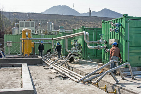 技術人員正在調試大岙生活垃圾填埋場生物天然氣提純設備。