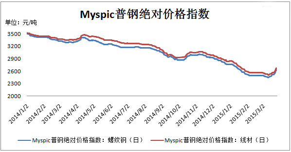 近兩年來,全國鋼價水平可謂是一路下行,根據(jù)Myspic螺紋鋼及線材絕對價格指數(shù)顯示,鋼價從2014年初的3500元/噸下跌至2500元/噸的水平(2015年2月份),下跌幅度高達1000元/噸,跌幅在28.6%。但3月中下旬以來,隨著天氣的逐漸轉暖,鋼市傳統(tǒng)旺季的到來,市場價格有回升態(tài)勢,加之北方市場價格的大幅拉漲,商家心態(tài)有所提振,全國鋼價平臺再度上移,Myspic螺紋鋼及線材絕對價格指數(shù)回升至2600元/噸,單從數(shù)據(jù)來看,實有反彈之勢。