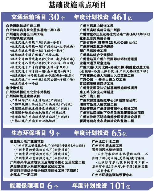 在交通運輸項目方面,將重點推進機場、地鐵、港口、高快速路等重大基礎(chǔ)設(shè)施項目建設(shè)。著力推進總里程306公里的11條地鐵項目建設(shè),爭取廣佛線西朗至燕崗段年內(nèi)開通試運營。加快推進廣州港南沙港區(qū)三期工程建設(shè),爭取2個7萬噸級、4個10萬噸級集裝箱泊位年內(nèi)基本完工。加快推進南沙港鐵路、廣東省連平(贛粵界)至從化公路等鐵路干線、高速公路項目建設(shè),重點推進南沙新區(qū)、廣州開發(fā)區(qū)、增城開發(fā)區(qū)等三大國家級開發(fā)新區(qū)基礎(chǔ)設(shè)施建設(shè)。