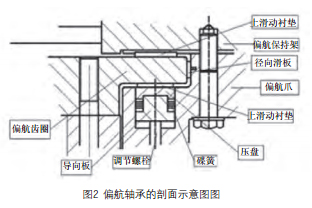 內(nèi)側(cè)面貼合的8塊徑向滑板,下表面貼合的八塊上滑動(dòng)襯墊,即為偏航軸承的主要摩擦和潤(rùn)滑部件,它們都是由具有自潤(rùn)滑功能的 PETP 材料制成,此種 PETP 材料的靜摩擦系數(shù)為0.1,動(dòng)摩擦系數(shù)為0.06。圖2偏航軸承的剖面示意圖。