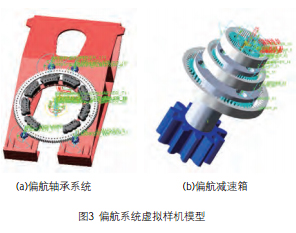 對(duì)于偏航軸承系統(tǒng) :偏航大齒圈與大地建立固定副約束 ;四個(gè)偏航小齒輪分別與機(jī)艙上的定位孔建立旋轉(zhuǎn)副約束 ;上滑動(dòng)襯墊、下滑動(dòng)襯墊分別與偏航大齒圈之間建立旋轉(zhuǎn)副約束,并各自定義摩擦 ;徑向滑板與偏航大齒圈內(nèi)側(cè)面建立定義接觸,與機(jī)艙建立固定副約束 ;四個(gè)偏航小齒輪分別與大齒圈之間添加接觸 ;徑向滑板與大齒圈內(nèi)測(cè)面添加接觸。對(duì)于偏航減速箱 :三個(gè)外齒圈分別與大地之間建立固定副約束 ;一級(jí)太陽(yáng)輪與一級(jí)行星架間建立旋轉(zhuǎn)副約束 ;三個(gè)一級(jí)行星輪分別與一級(jí)行星架間建立旋轉(zhuǎn)副約束;一級(jí)行星架與一級(jí)外齒圈之間建立旋轉(zhuǎn)副約束 ;下一級(jí)太陽(yáng)輪與上一級(jí)行星架之間建立固定約束保證行星輪系運(yùn)動(dòng)的傳遞,其余約束與第一級(jí)行星輪系的約束相同 ;每個(gè)齒輪之間均定義接觸。圖 3 為添加完約束后的偏航軸承系統(tǒng)和偏航減速箱的虛擬樣機(jī)模型。