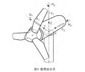 依據(jù) IEC61400 - 3 標(biāo)準(zhǔn),選用風(fēng)譜 kaimal 模型模擬風(fēng)速,湍流強(qiáng)度為 C,工況如表 1 所示。通過(guò) Bladed 軟件仿真出不同工況下的風(fēng)載荷,機(jī)艙的傾覆力矩 Mx、My,偏航力矩 Mz,垂直載荷 Fz,水平荷載Fx、Fy。載荷作用坐標(biāo)系如圖 4 所示。