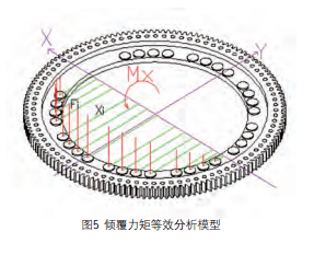動(dòng)襯墊上的正壓力發(fā)生變化,因此會(huì)導(dǎo)致其產(chǎn)生的摩擦阻力矩發(fā)生變化。本文借鑒傾覆力矩對(duì)螺栓組拉力的求解方法對(duì)傾覆力矩 Mx、My 進(jìn)行等效處理。如圖 5 所示,當(dāng)傾覆力矩 Mx 作用時(shí),會(huì)對(duì) X 軸兩側(cè)的摩擦片正壓力產(chǎn)生影響,在圖 5 的情況下,會(huì)導(dǎo)致 X 軸左邊的下滑動(dòng)襯墊受壓,X軸右邊的上滑動(dòng)襯墊受壓,對(duì)于下滑動(dòng)襯墊,設(shè)每個(gè)下滑動(dòng)襯墊受傾覆力矩作用產(chǎn)生的壓力為 Fi,作用點(diǎn)到 X 軸距離為 Xi,則有 :