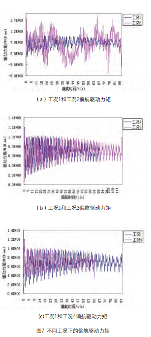 從圖 7 中各工況下偏航驅(qū)動(dòng)力矩的對(duì)比中可以看出,由于工況 2 為湍流等級(jí)為 C 級(jí)的湍流風(fēng),而工況 1 為普通陣風(fēng),從圖 7a 可明顯看到偏航總驅(qū)動(dòng)力矩的波動(dòng)情況,可見(jiàn)湍流風(fēng)對(duì)風(fēng)電機(jī)組偏航總驅(qū)動(dòng)力矩影響很大。工況 1、工況 3 和工況 4 的偏航驅(qū)動(dòng)力矩幅值基本是相同的,但由于工況 3 偏航速度較小,在偏航開(kāi)始時(shí)刻工況 3 偏航驅(qū)動(dòng)力矩較小。不同的偏航速度(圖 7b)和不同的偏航角度(圖7c)下,偏航所需時(shí)間是不同的。
