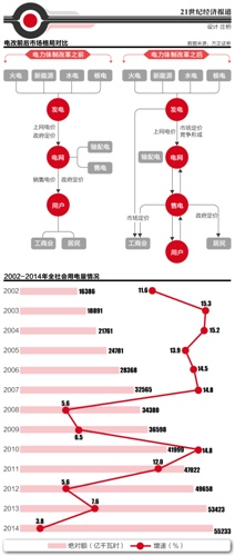 與2002年電改方案相比,新一輪電改側(cè)重于體制改革,而非機(jī)構(gòu)上的調(diào)整。前者猶如外科手術(shù),改革效應(yīng)可以在短期內(nèi)釋放,廠網(wǎng)分開、主輔分離立竿見影;后者則注重內(nèi)部調(diào)理,通過較長時(shí)間的滲透、演繹,重構(gòu)舊有電力市場秩序。