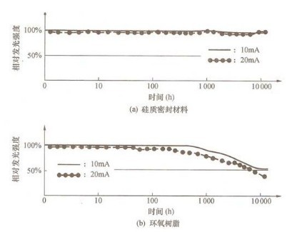 圖2 硅質(zhì)密封材料與環(huán)氧樹脂對LED光學(xué)特性的影響