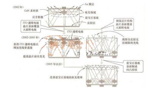 改善白光LED的發(fā)光效率的具體方法是改善芯片結(jié)構(gòu)與封裝結(jié)構(gòu),達(dá)到與低功率白光LED相同的水準(zhǔn),主要原因是電流密度提高2倍以上時(shí),不但不容易從大型芯片取出光線,結(jié)果反而會(huì)造成發(fā)光效率不如低功率白光LED,如果改善芯片的電極構(gòu)造,理論上就可以解決上述取光問題。