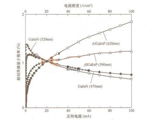 圖7 GaInN系LED的量子效率與電流密度的關(guān)系