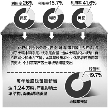 據(jù)有關(guān)部門調(diào)查,河北省氮、磷、鉀肥當(dāng)季平均利用率分別為26%、15.7%和41.6%,均略低于全國平均水平?;手惺S囵B(yǎng)分通過徑流、淋溶、吸附等進入環(huán)境,增加了土壤中硝態(tài)氮、銨態(tài)氮含量,造成土壤酸化、板結(jié),有機質(zhì)減少和地力下降,尤其是設(shè)施農(nóng)業(yè),化肥農(nóng)藥施用強度更大,個別蔬菜產(chǎn)區(qū)土壤板結(jié)問題突出。