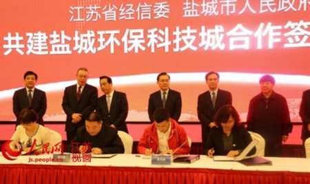 鹽城市委書記朱克江、市長王榮平與江蘇省經(jīng)信委主任徐一平共同出席合作共建鹽城環(huán)??萍汲呛灱s儀式