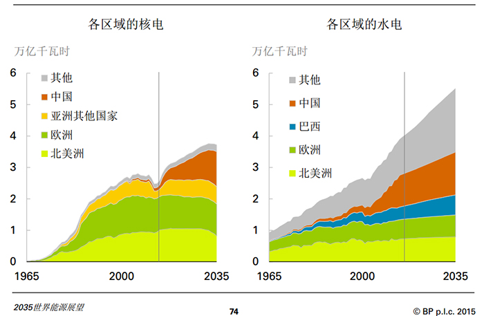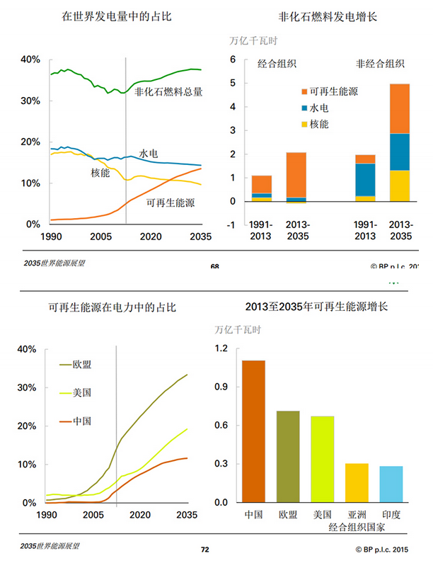 在非化石燃料中,可再生能源(包括生物燃料)的比重迅速提高,從當前的3%升至2035年的8%,并在2020年代超過核電,在2030年代初超過水電。