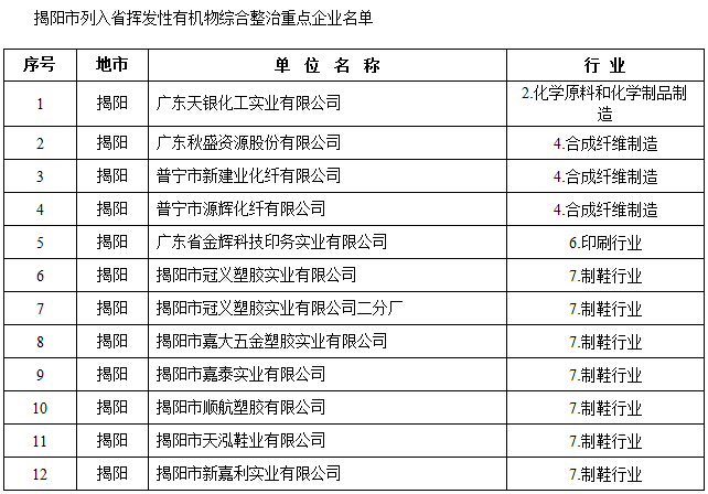 附表:揭陽市列入省揮發(fā)性有機(jī)物綜合整治重點(diǎn)企業(yè)名單