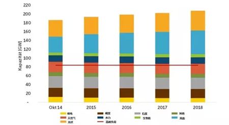 圖為2014年10至2018德國能源組成結(jié)構(gòu)及預(yù)測