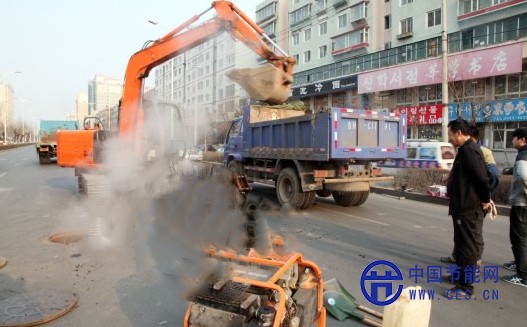 記者在現(xiàn)場看到,冒出的熱水正順著馬路向外流淌。延吉市集中供熱有限公司工作人員用抽水機(jī)將滲漏的熱水引向附近下水管道,一臺(tái)重型大車正在破路。