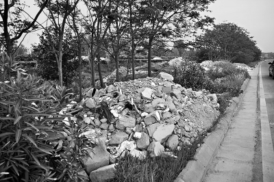 鄭州市東三環(huán)道路旁隨意傾倒的建筑垃圾。