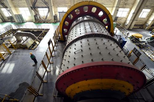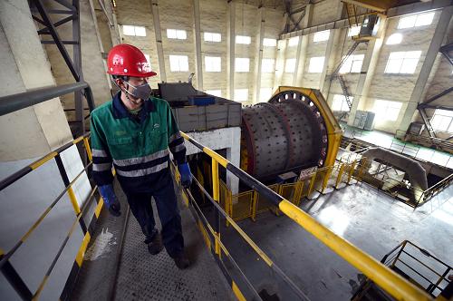 金昌市金川公司銅爐渣選礦車間,工人查看球磨機運行情況