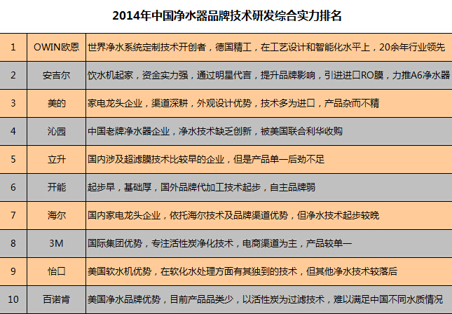 由凈水行業(yè)研究機(jī)構(gòu)公布的《2014年中國(guó)凈水器技術(shù)研發(fā)實(shí)力綜合排名》,也備受業(yè)內(nèi)外關(guān)注,特別是排名前三的OWIN歐恩凈水器、安吉爾凈水器、美的凈水器,這三大品牌凈水涉足這一領(lǐng)域較早,是以技術(shù)領(lǐng)導(dǎo)潮流的典型代表。這些企業(yè)擁有了雄厚的資金、技術(shù)和生產(chǎn)實(shí)力,能夠不斷在凈水機(jī)領(lǐng)域推陳出新,引導(dǎo)技術(shù)潮流,這也是目前中國(guó)凈水機(jī)市場(chǎng)規(guī)范發(fā)展最為需要的。那么,這三家中國(guó)凈水器市場(chǎng)領(lǐng)導(dǎo)品牌各有哪些優(yōu)勢(shì)與不足呢?