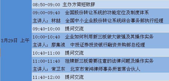 主要議題: 邀請股轉(zhuǎn)公司和相關(guān)主辦券商深入解讀新三板政策和掛牌實(shí)務(wù)。邀請已掛牌企業(yè)負(fù)責(zé)人進(jìn)行經(jīng)驗(yàn)交流。