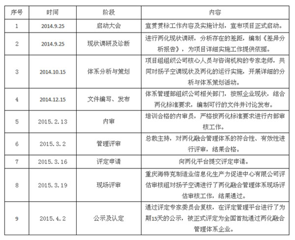 2014年公司成為國家首批兩化融合管理體系貫標試點企業(yè),為確保更有效地對貫標工作進行實施和落實,揚子空調(diào)成立兩化融合管理體系委員會,并選擇工業(yè)和信息化部電子第五研究作為貫標工作的咨詢機構(gòu),整個貫標工作歷程如下: