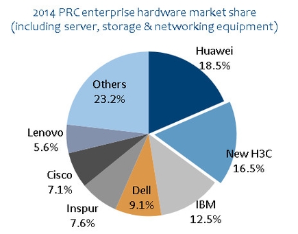 圖:2014年中國企業(yè)業(yè)務(wù)硬件市場(chǎng)份額(包括服務(wù)器、存儲(chǔ)和網(wǎng)絡(luò)設(shè)備)