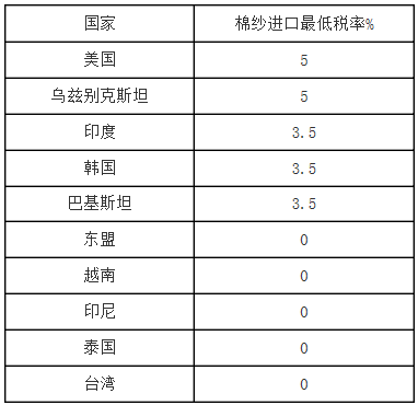 印度作為“一帶一路”上的重要大國(guó)、全球最大的棉花生產(chǎn)國(guó)、全球最大的棉紗出口國(guó)之一,減免關(guān)稅政策的出臺(tái)勢(shì)必對(duì)該國(guó)棉花產(chǎn)業(yè)產(chǎn)生重大影響。據(jù)印度業(yè)內(nèi)人士透露,印度總理訪華期間中國(guó)領(lǐng)導(dǎo)人表示將促進(jìn)中印之間的棉紗貿(mào)易,并承諾將下調(diào)印度棉紗進(jìn)口關(guān)稅。據(jù)某位業(yè)內(nèi)人士稱,關(guān)稅的減免及棉紗進(jìn)口無(wú)配額限制,這兩大優(yōu)勢(shì)或?qū)⒋龠M(jìn)中國(guó)印巴紗進(jìn)口量的再次突破,將會(huì)促進(jìn)國(guó)內(nèi)棉花與紡企的快速轉(zhuǎn)型。印度承諾將下調(diào)印度棉紗進(jìn)口關(guān)稅。下圖是中國(guó)從各國(guó)家、地區(qū)進(jìn)口棉紗的最低稅率。