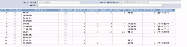 其次是款型匹配設(shè)置。由于每款服裝需要管理的款型部位均可能各不相同,為了更好地維護(hù)企業(yè)的生產(chǎn)款型數(shù)據(jù),系統(tǒng)對(duì)服裝部位采用動(dòng)態(tài)管理的方式進(jìn)行設(shè)置,即針對(duì)每款服裝的具體特點(diǎn),在系統(tǒng)中采用自定義方法靈活設(shè)置該款服裝所需要涉及和管理的部位明細(xì),并對(duì)該款服裝設(shè)置具體的量體部位和順序,以及匹配的上下限。