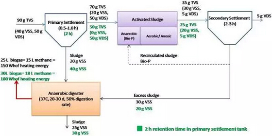 圖9展示了傳統(tǒng)硝化/反硝化活性污泥工藝中沼氣的產生過程。進水中總揮發(fā)固體TVS含量為90g/PE,其中40g是揮發(fā)性懸浮固體(VSS),50g是揮發(fā)性溶解固體(VDS)。為了保證反硝化過程有足夠的有機物,預處理工藝中初沉池的停留時間只有0.5~1小時,在這個工況下,大約有20g的TVS將會被沉淀并作為初沉污泥排至消化池,而剩余的70gTVS將會送往活性污泥反應器。假設70gTVS中有50%將被礦化,而剩余50%將留在水中,被礦化的TVS中包括30g的VSS和5g的VDS。在二級生物反應器中,30g的VSS經過3小時的沉淀將全部得以去除,并作為二沉污泥送往中溫厭氧消化罐。這樣一來,消化罐將接收50gVSS,其中20g來自初沉污泥,30g來自二沉污泥。消化罐的反應時間設置為20~30天,消化率大約為50%。25g有機物將產生25L沼氣,而其中甲烷含量是60%左右,也就是說甲烷產量是15L。15L甲烷將產生150Wh的熱值。