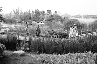 在濕地上修建的木棧道,已成為人們?nèi)粘P蓍e的好去處。張菊芬攝