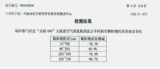 2014年6月我們曾對一臺6噸級燃煤鍋爐進行煙氣清洗試驗,由中國科學院廣州地球化學研究所派人現(xiàn)場抽樣檢驗,結(jié)果表明空氣清洗法能攔截粒徑為0.45微米以上顆粒物。該技術已發(fā)明專利并入選2014年國家科技成果庫。
