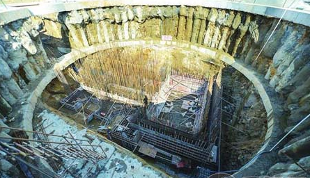 昨日,記者來(lái)到位于天大山東南側(cè)的金井灣污水處理廠,一進(jìn)現(xiàn)場(chǎng),就看到這個(gè)直徑數(shù)十米的“天坑”,深達(dá)13米,甚是駭人。走近一看,打完樁基的粗格柵仿佛一個(gè)環(huán)形的“石林”,原來(lái)是支護(hù)樁根據(jù)淤泥層的地質(zhì)特征進(jìn)行排列形成的“石林”。據(jù)金井灣污水處理廠的項(xiàng)目經(jīng)理張志永介紹,這圈“石林”高約3米,共50根,支護(hù)樁是用混凝土包著鋼筋做成的。