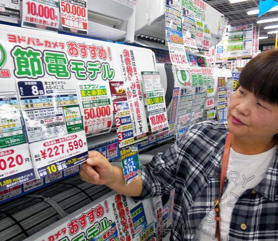 1日上午,居住在大阪府大東市的田井夫婦來到Y(jié)ODOBASHI CAMERA梅田店選購空調(diào)。自從5月丈夫關(guān)閉了自己經(jīng)營的印刷店后,呆在家里的時間增多,為了節(jié)省電費(fèi),夫妻決定更換一臺節(jié)能空調(diào)。二人表示:“雖然買空調(diào)的費(fèi)用對我們來說花銷不小,但估計(jì)將來電費(fèi)還會上漲,因此還是決定購買節(jié)能空調(diào)。”