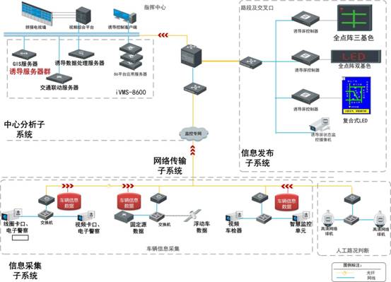 交通誘導(dǎo)系統(tǒng)由四個(gè)子系統(tǒng)構(gòu)成,即信息采集子系統(tǒng),網(wǎng)絡(luò)傳輸子系統(tǒng)、中心分析子系統(tǒng)和信息發(fā)布子系統(tǒng)。前端采集的車輛信息經(jīng)過中心分析計(jì)算后得出路況交通狀態(tài),也可以通過視頻監(jiān)控人工判斷路況交通狀態(tài),并在外場(chǎng)交通誘導(dǎo)屏予以公布,實(shí)現(xiàn)道路路況交通狀態(tài)的實(shí)時(shí)通報(bào)。