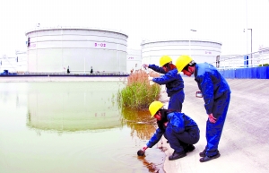 注重源頭預(yù)防是企業(yè)環(huán)保的第一道關(guān)口。圖為一家化工企業(yè)檢測(cè)人員正在生產(chǎn)庫(kù)區(qū)取水樣進(jìn)行監(jiān)測(cè)化驗(yàn)。 (應(yīng)紅楓 攝)
