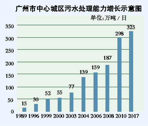據(jù)廣州市凈水公司介紹,從1989年第一座污水處理廠建成運(yùn)行后的14年里,廣州市中心城區(qū)污水處理廠的建設(shè)速度一直不溫不火,2003年,污水處理能力只有77萬噸/日。但是到了2008年,短短5年時間,污水處理能力大幅增長至187萬噸/日。再往后只用了2年,廣州亞運(yùn)前夕,污水處理能力已經(jīng)增長至298萬噸/日,使中心城區(qū)以往又黑又臭的水環(huán)境有了很大改觀。
