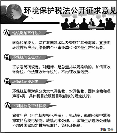 國務(wù)院法制辦今天就《中華人民共和國環(huán)境保護(hù)稅法(征求意見稿)》(以下簡稱意見稿)向社會公開征求意見,有關(guān)單位和各界人士可以在7月9日前提出意見。意見稿規(guī)定,對超標(biāo)、超總量排放污染物的,加倍征收環(huán)保稅;對依照環(huán)境保護(hù)稅法規(guī)定征收環(huán)保稅的,則不再征收排污費(fèi)。
