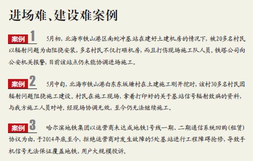 盡管如此,進(jìn)場(chǎng)難問題依然在各地上演。2015年5月下旬,北海市鐵山港區(qū)南蛇沖基站在建好土建機(jī)房的情況下,被20多名村民以輻射問題為由阻撓安裝。