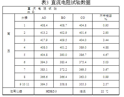 “規(guī)程”規(guī)定變壓器在運行中:1 600kV A及以上的,各相測得的相互差值小于平均值的2%,線間測得的相互差值應小于平均值的1%。從表中可以看出,直流電阻基本無規(guī)律,且不平衡率除一檔外均超標。