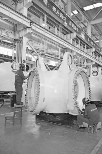 2015年,公司計(jì)劃生產(chǎn)風(fēng)電機(jī)組757套,至目前,已經(jīng)生產(chǎn)192套,實(shí)現(xiàn)銷售收入12363萬(wàn)元,上繳稅金241.29萬(wàn)元,實(shí)現(xiàn)利潤(rùn)201.5萬(wàn)元。圖為甘肅金風(fēng)風(fēng)電設(shè)備制造有限公司總裝車間。