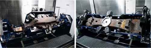 除了輪對(duì)的解決方案,達(dá)諾巴特鐵路系統(tǒng)公司還開發(fā)了加工鑄鐵轉(zhuǎn)向架加工的解決方案(用于貨車的3件結(jié)構(gòu)),在高速臥式加工中心上通過旋轉(zhuǎn)裝置(B軸)及專用的機(jī)床卡具來(lái)加工。